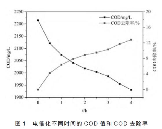 利用電催化處理該印染廢水,其結果見圖1。從圖1 中可以看出,隨著電解時間的延長,COD 值逐漸減小,但是COD 的去除率不大,到第4 h 時,COD 的去除率為12.82%,對應的COD 值為1 931mg/L,表明電催化法去除該印染廢水中的COD 效果不佳,分析原因可能是該廢水的pH 為強堿性,不利于電催化產(chǎn)生強氧化性的•OH。