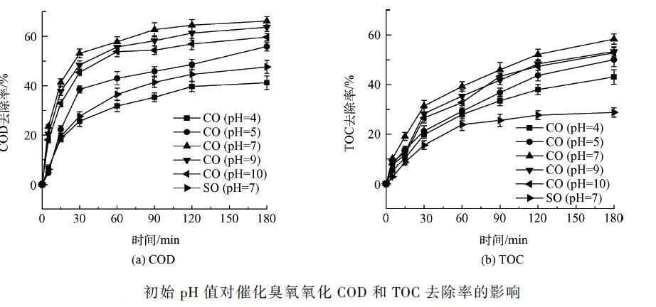由圖1可知,催化臭氧氧化(catalytic ozonation,CO)的COD 去除率可以達(dá)到(66. 2 ± 1. 7)% ,比單獨(dú)臭氧氧化(single ozonation,SO) 的(47. 6 ± 2. 6)% 提高了近20 個(gè)百分點(diǎn);而TOC 去除率則可以達(dá)到(58. 4 ± 2. 1)% ,比單獨(dú)臭氧氧化的(28. 8 ± 1. 9)% 提高了近1 倍。調(diào)節(jié)廢水pH 值,無(wú)論是酸性(pH = 4,5),還是堿性(pH = 9,10),催化臭氧氧化的效果都不如中性(pH = 7)的效果好,這可能是因?yàn)榱u基氧化鐵的零電荷點(diǎn)(pHpzc )在中性附近,過酸和過堿都影響了羥基氧化鐵表面羥基的電荷形態(tài)。需要注意的是:當(dāng)pH = 4 時(shí),COD 的去除率不如單獨(dú)氧化的,但TOC 的去除率卻比單獨(dú)氧化的高。這是因?yàn)閱为?dú)臭氧氧化很難降解煤化工生化出水中的難降解有機(jī)物,從而TOC去除率低;而pH = 4 時(shí)催化臭氧氧化一定程度上降解了這部分難降解有機(jī)物,甚至是難以測(cè)出COD 的有機(jī)物,但效果沒有中性和堿性條件下的好,依然有一部分降解不完全,反而被檢測(cè)出COD,從而COD 的去除率反而降低。