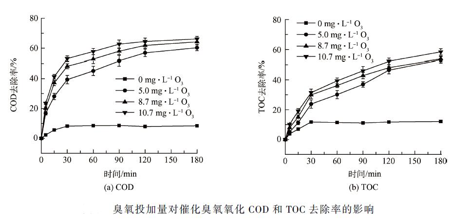 臭氧是有機(jī)物降解的直接動(dòng)力,其投加量直接影響催化臭氧氧化的速率及效果。實(shí)驗(yàn)通過調(diào)節(jié)所用臭氧發(fā)生器電流檔位改變臭氧投加量,并用碘量法測(cè)出臭氧產(chǎn)生量。廢水不調(diào)節(jié)pH 值(中性),催化劑投加量為200 g·L - 1 。由圖3 可知,不通臭氧,單純通空氣時(shí),催化劑對(duì)廢水只有吸附作用,此時(shí)COD 和TOC 的去除率僅有(8. 6 ± 0. 3)% 和(12. 1 ± 0. 4)% 。增大臭氧投加量對(duì)COD 和TOC 的去除率的提有限,這可能與臭氧的利用率有關(guān),有效利用的臭氧較少,但增大臭氧投加量,有利于三相界面的傳質(zhì),反應(yīng)速率更快,特別是在短時(shí)間內(nèi)效果顯著。