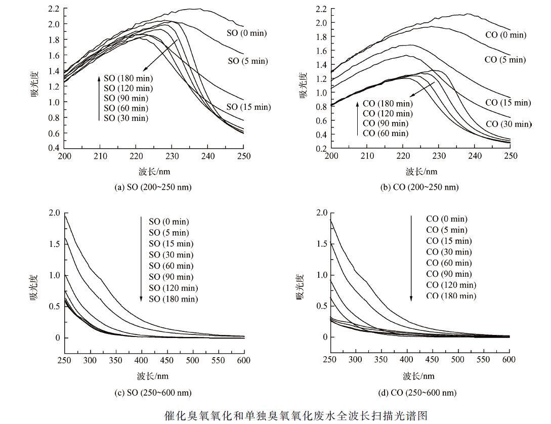 全波長(zhǎng)掃描可以反映溶液整體對(duì)某一波長(zhǎng)光的吸收性,適合分析含多種有機(jī)物的實(shí)際廢水。其中,紫外譜圖提供的是常見官能團(tuán)信息。若溶液在220 ~ 250 nm 波段有強(qiáng)烈吸收,說(shuō)明該溶液化合物中存在共軛雙鍵(共軛二烯烴、不飽和醛、不飽和酮),否則可能是飽和脂肪烴、脂環(huán)烴或其衍生物;化合物在250 ~290 nm 波段有強(qiáng)烈吸收,說(shuō)明化合物分子中有苯環(huán)存在(以UV254 為代表);化合物在300 nm 以上有強(qiáng)烈吸收,說(shuō)明分子中有較大的共軛體系(大分子腐殖質(zhì),以UV410 為代表)。廢水不調(diào)節(jié)pH 值(中性),臭氧投加量為10. 7 mg·min - 1 ,催化劑投加量為200 g·L - 1 。