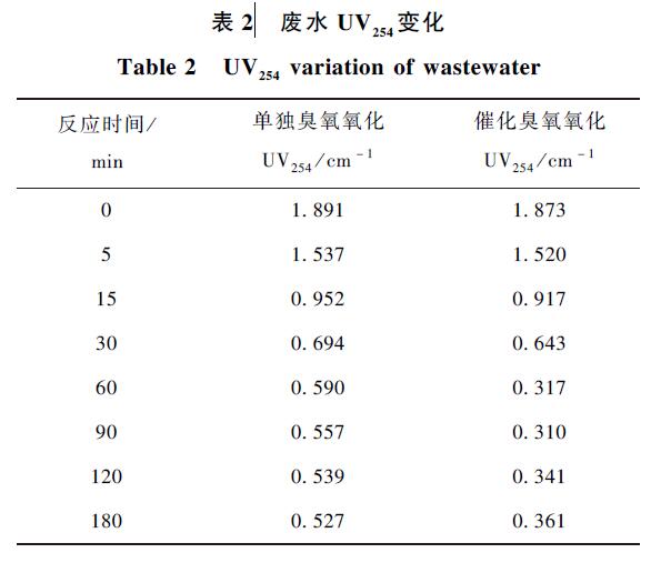 由表2 可知,單獨(dú)臭氧氧化對(duì)廢水UV254 的去除率為72. 1% ,催化臭氧氧化對(duì)廢水UV254 的去除率為80. 7% ,催化臭氧氧化的處理效果優(yōu)于單獨(dú)臭氧氧化。