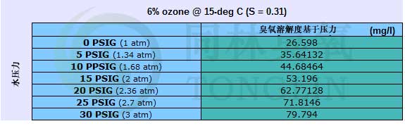 將水壓輸入溶解度計(jì)算為P.水壓力計(jì)算為大氣壓。0 psig = 1大氣壓= 14.7 psia。隨著對水的壓力增加,臭氧的溶解度增加。上表和下表是基于臭氧濃度為6重量%(85.8g / m 3)和15℃水溫的該計(jì)算的實(shí)例。這些是許多臭氧應(yīng)用的非常平均值。