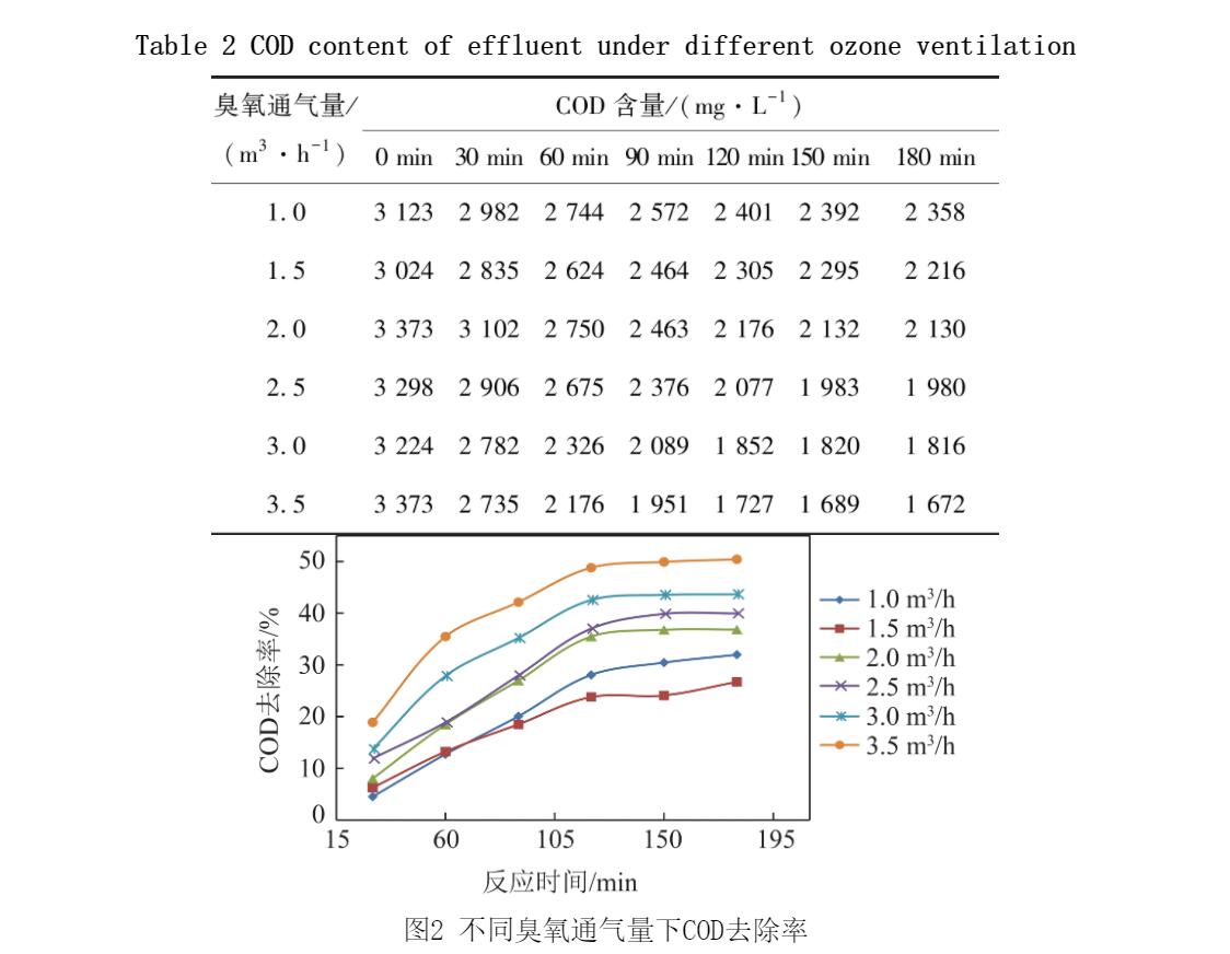 綜上COD去除效果與臭氧通氣量密切相關(guān)。臭氧通氣量越大,在同等條件下COD去除率越大,但會(huì)增加處理成本。因此考慮COD去除率及臭氧通氣量成本,臭氧通氣量選擇為:1.5 m3/h≤臭氧通氣量≤2.5 m3/h。