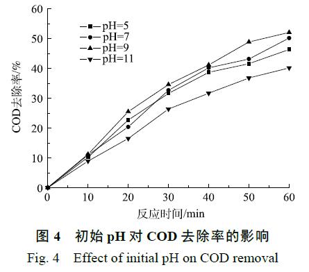 實驗選取了 4 個不同的 pH,用 NaOH 調(diào)節(jié)廢水 pH,臭氧催化氧化時間為 60 min,臭氧的投加量為 300 mg·L−1。由 圖 4 可知,初 始 pH 對臭氧催化氧化降 解COD 的影響較大,隨著 pH 的升高,COD 的去除率呈上升趨勢,當(dāng)初始 pH 從 5 升到 9 時,COD 的去除率從 46.4% 升至 52.1%。臭氧間接氧化較多發(fā)生在中、堿性條件下,臭氧在堿性條件下很不穩(wěn)定,易促進(jìn)其自身分解[18],可通過自發(fā)的一系列鏈?zhǔn)椒磻?yīng)生成強(qiáng)氧化性的·OH[19],更有利于 COD 的去除。此外隨著廢水pH 的升高,水中 OH−濃度增加,加劇了臭氧分解產(chǎn)生·OH。