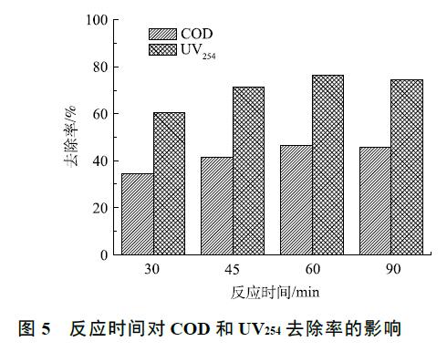 臭氧催化氧化實驗在室溫下進(jìn)行,在廢水初始 pH 為 5,通過調(diào)節(jié)臭氧進(jìn)氣濃度控制臭氧投加量為 300 mg·L−1 的條件下,考察了臭氧催化氧化時間對有機(jī)物去除效果的影響,結(jié)果如圖 5 所示。當(dāng)反應(yīng)時間從 30 min 增至 60 min 時,COD 和 UV254 的去除率分別從 34.6%、60.4% 升高到 46.4%、76.3%,有機(jī)物的去除率隨反應(yīng)時間的延遲而增加。這是由于·OH 在水中的壽命很短 [22],大約 為 10−9 s,臭氧催化氧化中·OH 氧化反應(yīng)實際發(fā)生在催化劑周圍,在傳質(zhì)不充分的反應(yīng)條件下,部分·OH 在未知有機(jī)物發(fā)生反應(yīng)之前就已經(jīng)被淬滅。當(dāng)臭氧催化氧化時間縮短時,單位時間內(nèi)臭氧投加量加大,產(chǎn)生的·OH 增多,導(dǎo)致大量·OH 未參與反應(yīng)就淬滅,從而導(dǎo)致有機(jī)物去除率下降。當(dāng)反應(yīng)時間到達(dá)一定的臨界點(diǎn)時,再延長反應(yīng)時間,其去除率增加不再明顯,臭氧催化氧化反應(yīng)從 60 min延長至 90 min 時,COD 和 UV254 的去除率基本不變。