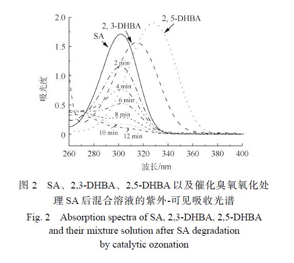 圖 2為 SA、2,3-DHBA和 2,5-BHBA的紫外-可見(jiàn)吸收光譜圖以及 CaO催化臭氧氧化處理后的紫外-可見(jiàn)吸收光譜??梢钥闯?,SA在 302 nm處有 很大吸收峰,而 2,3-DHBA和 2,5-DHBA分別在315 nm和 330 nm處出現(xiàn) 很大吸收峰,SA經(jīng)過(guò)催化臭氧氧化處理后 很大吸收峰波長(zhǎng)向右移動(dòng),在2,3-DHBA和 2,5-DHBA的大吸收峰處有一定的吸收,證明在該過(guò)程中有 · OH產(chǎn)生。