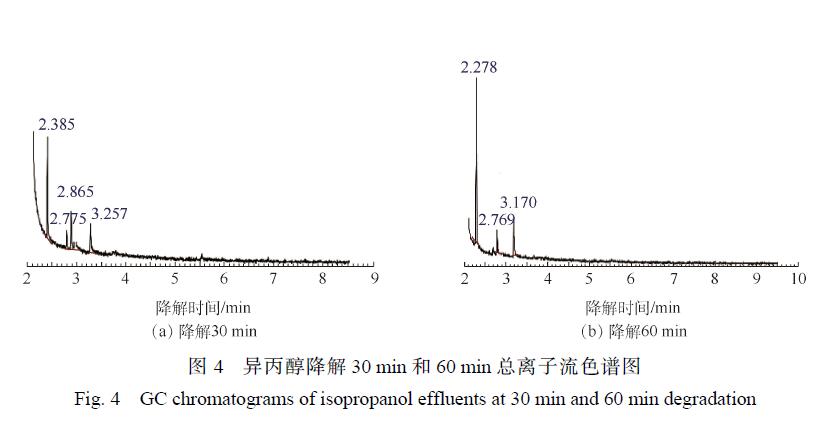 為了研究廢液的降解路徑,以廢液主要成分異丙醇和乙二醇單丁醚為例進(jìn)行探討,對(duì) 2種物質(zhì)進(jìn)行降解并對(duì)降解產(chǎn)物用GC/MS進(jìn)行檢測(cè)。