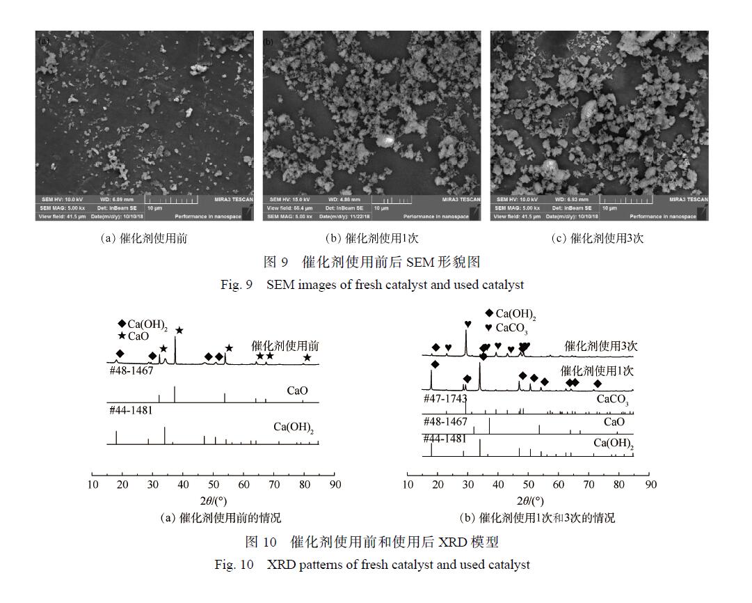 圖 10(b)為催化劑使用 1次和使用 3次后的 XRD圖。催化劑使用 1次后的 XRD譜圖在 2θ為18°、28.7°、34.1°、47.1°和 50.9°處存在較強(qiáng)的峰,這些峰與 Ca(OH)2的特征峰一致,表明其主要成分是 Ca(OH)2。而使用 3次的催化劑測(cè)出的 2θ為 23°、 29.4°、 39.4°、 43.2°和 47.1°對(duì)應(yīng)的峰 是CaCO3的特征峰,說(shuō)明催化劑的失活過(guò)程主要是:經(jīng)過(guò)多次循環(huán)后的催化劑與水結(jié)合變成了Ca(OH)2,形成的 Ca(OH)2與礦化產(chǎn)物 CO2結(jié)合從而變?yōu)?CaCO3, 很終由于多次反應(yīng)后 CaCO3含量不斷增加從而導(dǎo)致催化劑催化效率逐漸降低。