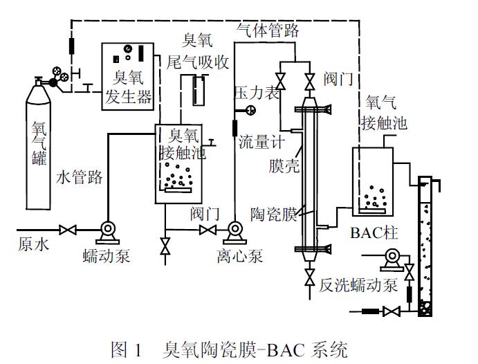 膜工藝在飲用水處理中的應(yīng)用日益增多,其對(duì)水中顆粒物有很好的分離能力,膜出水濁度一般在0.2NTU 以下,在水處理中有很大的應(yīng)用潛力.但實(shí)踐證明,膜的污染和膜工藝無(wú)法有效去除溶解性有機(jī)物和氨氮,阻礙了其廣泛應(yīng)用.陶瓷膜具有機(jī)械強(qiáng)度高、化學(xué)穩(wěn)定性和熱穩(wěn)定性高等優(yōu)點(diǎn).陶瓷膜能夠與臭氧直接接觸,可有效控制膜污染.臭氧氧化在控制膜污染的同時(shí)還能降低有機(jī)物的分子量,提高其可生化性.但有報(bào)道指出,臭氧氧化可降低膜對(duì)的有機(jī)物的去除效果.為提高膜對(duì)有機(jī)物的去除,通常在膜工藝前設(shè)置粉末活性炭或顆粒活性炭等預(yù)處理工藝.預(yù)處理工藝能夠改變水中顆粒物和有機(jī)物的賦存形態(tài),降低膜的有機(jī)物負(fù)荷,減輕膜污染,提高有機(jī)物的去除效果.但此類(lèi)預(yù)處理工藝多利用了活性炭的吸附作用,且對(duì)氨氮的去除無(wú)顯著改善.研究表明,生物活性碳(BAC)可有效去除水中的有機(jī)物和氨氮.因此,在臭氧-陶瓷膜后設(shè)置BAC工藝,形成臭氧陶瓷膜-BAC組合工藝,可在臭氧控制膜污染的基礎(chǔ)上去除有機(jī)物和氨氮,能夠一舉兩得.