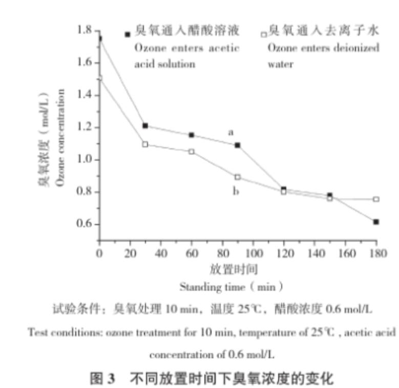(3)配制濃度為0.6 mol/L的醋酸溶液,在25℃條件下,通入臭氧處理10 min,分別放置30、60、90、120、150、180 min,在每個(gè)放置時(shí)間后取樣測(cè)定樣品中臭氧濃度。與此同時(shí),讓臭氧通入去離子水作對(duì)照,在一樣的溫度、臭氧處理時(shí)間以及通氣之后放置相同時(shí)間段測(cè)定樣品中的臭氧濃度。