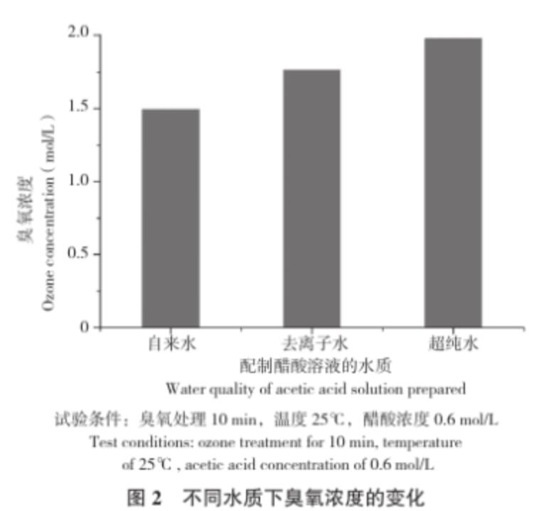 (2)分別用自來(lái)水、去離子水和超純水配制醋酸濃度為0.6 mol/L的醋酸溶液,在25℃條件下,通入臭氧處理10 min,取樣測(cè)定每個(gè)樣品中的臭氧濃度。