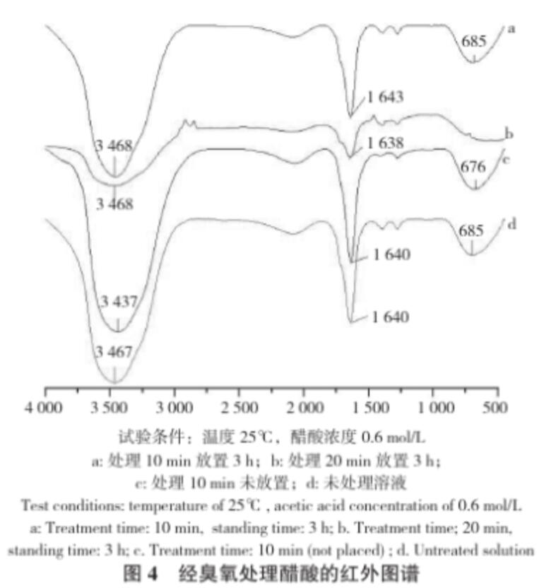 從圖3可以看出,在相同的試驗(yàn)條件下,隨著放置時(shí)間的增加,醋酸溶液中的臭氧濃度急劇下降,當(dāng)放置時(shí)間延長(zhǎng)時(shí),溶解的臭氧會(huì)有一部分揮發(fā)到空氣中,還有部分分解成氧氣,導(dǎo)致溶解度下降;在相同時(shí)間下,醋酸溶液中的臭氧濃度比去離子水中高,這表明臭氧在醋酸溶液溶液中比在水中更穩(wěn)定,加入少量醋酸利于臭氧貯存。從圖4可以看出,臭氧處理后放置3 h的醋酸有較為尖銳的吸收峰,其譜峰3 468 cm-1、3 437 cm-1、3 467 cm-1歸屬于O-H引起的伸縮振動(dòng),譜峰 1 643 cm-1、1 638 cm-1、1 640 cm-1歸屬于C=C引起的伸縮振動(dòng),譜峰685 cm-1、676 cm-1歸屬于C-O引起的伸縮振動(dòng)。而臭氧剛處理完的醋酸以及未處理的醋酸的峰值不同,說(shuō)明生成的O-H鍵和C-O導(dǎo)致吸收峰移動(dòng),從而造成它們的峰值有所偏移。
