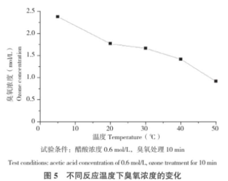 (5)配制濃度為0.6 mol/L的醋酸溶液,通入臭氧處理10 min,分別在5、20、30、40、50℃條件下取樣測(cè)定樣品中的臭氧濃度。