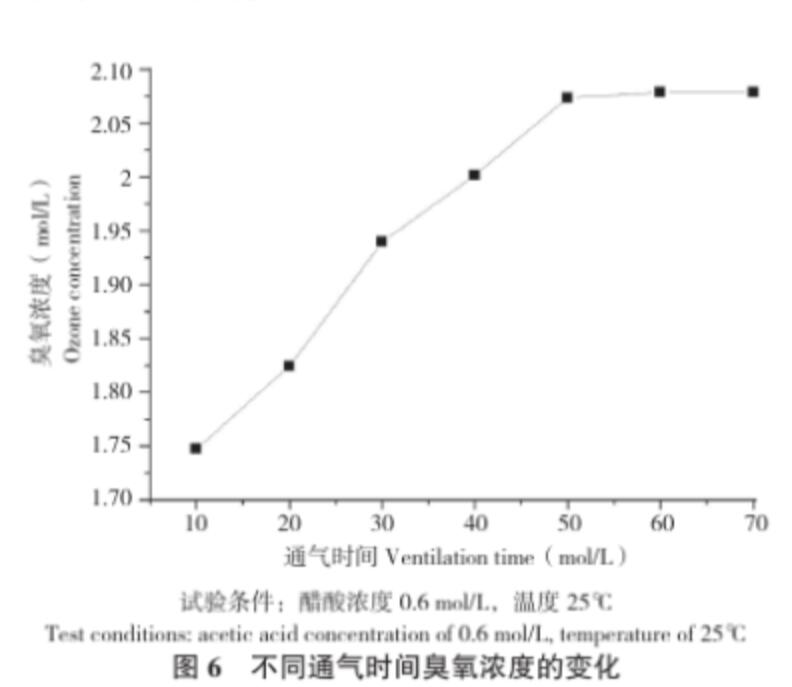 (6)配制濃度為0.6 mol/L的醋酸溶液,在溫度25℃的條件下,分別通入臭氧處理10、20、30、40、50、60、70 min,在每個(gè)時(shí)間段取樣測(cè)定樣品中的臭氧濃度。