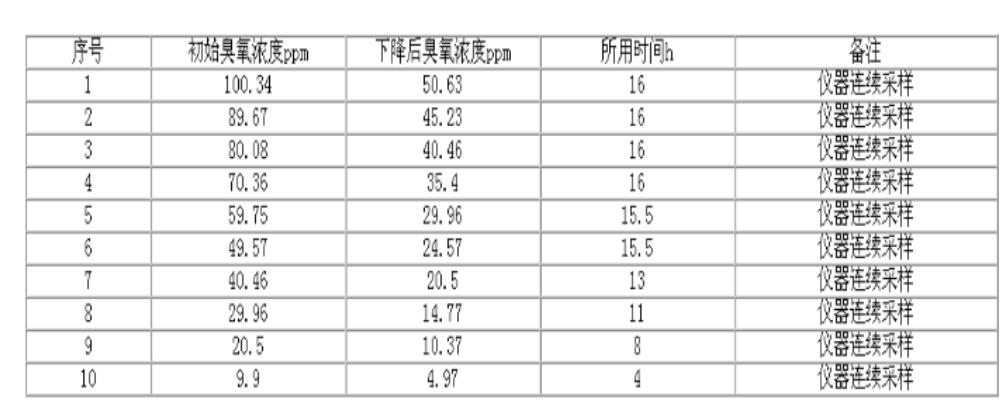 比利時臭氧專家W·J·馬舍蘭在《臭氧雨水的接觸和接觸器尾氣處理》文中認(rèn)為:臭氧在霧中的半衰期約為4~5h。國內(nèi)外一些臭氧資料中的半衰期相距很大。為此,我們用一容積為0.95mg/m3的玻璃柜,在環(huán)境溫度為20~25℃;環(huán)境溫度為60~80%Rh,臭氧濃度在200ppm以下的情況下做了一些實(shí)驗(yàn),現(xiàn)將結(jié)果抄錄如下。