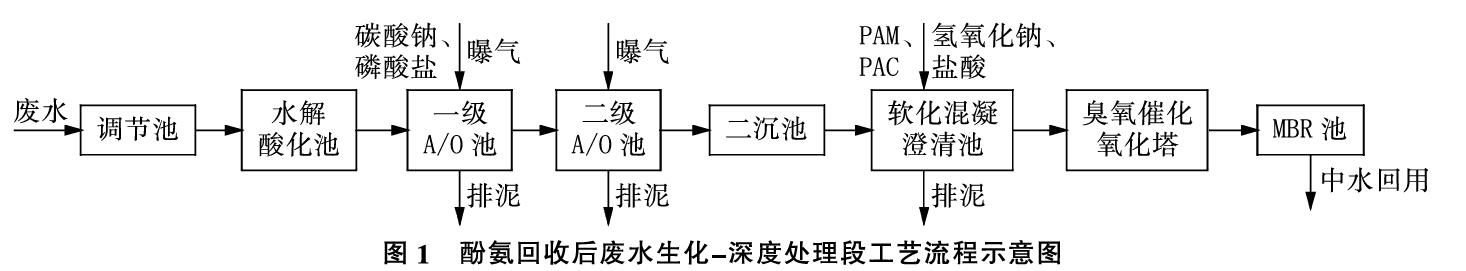 從表1水質(zhì)分析可知,廢水具有高COD、高氨氮、高酚等特點,因此一級處理采用水解酸化+生化A/0工藝:采用水解酸化工藝,可降解大分子有機物,提高B/C值;在A/0池中采用混合液和污泥回流的前置反硝化工藝,可在降解有機物的同時,將氨氮轉(zhuǎn)變?yōu)橄跛猁}、亞硝酸鹽,在反硝化過程中再轉(zhuǎn)化為氮氣。經(jīng)過生化處理后的廢水,污染物主要為難以降解的大分子,增加了深度處理的難度,因此深度處理采用臭氧催化氧化+MBR工藝:采用臭氧催化氧化的方式,打破大分子鏈,轉(zhuǎn)變?yōu)榭山到獾男》肿樱煌瑫r采用MBR工藝,攔截大分子有機物和活性污泥,增加有機物的降解時間,保障出水水質(zhì)。酚氨回收后廢水生化-深度處理段工藝流程示意圖見圖1。