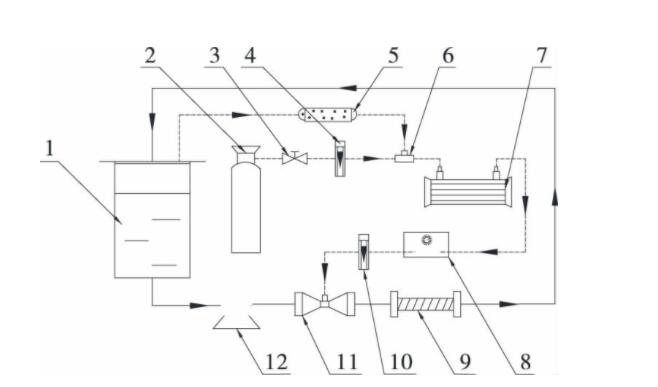 1. 儲液罐 2. 氧氣瓶 3. 減壓閥 4、10. 流量計 5. 干燥管 6. 三通閥 7. 臭氧發(fā)生器 8. 調(diào)節(jié)氣泵 9. 靜態(tài)混合器 11. 射流器 12. 離心泵