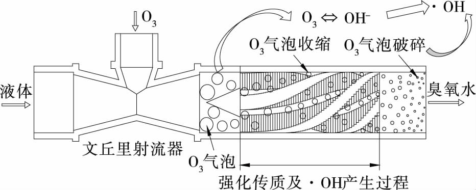 圖2 靜態(tài)混合器強化臭氧傳質(zhì)及·OH產(chǎn)生原理