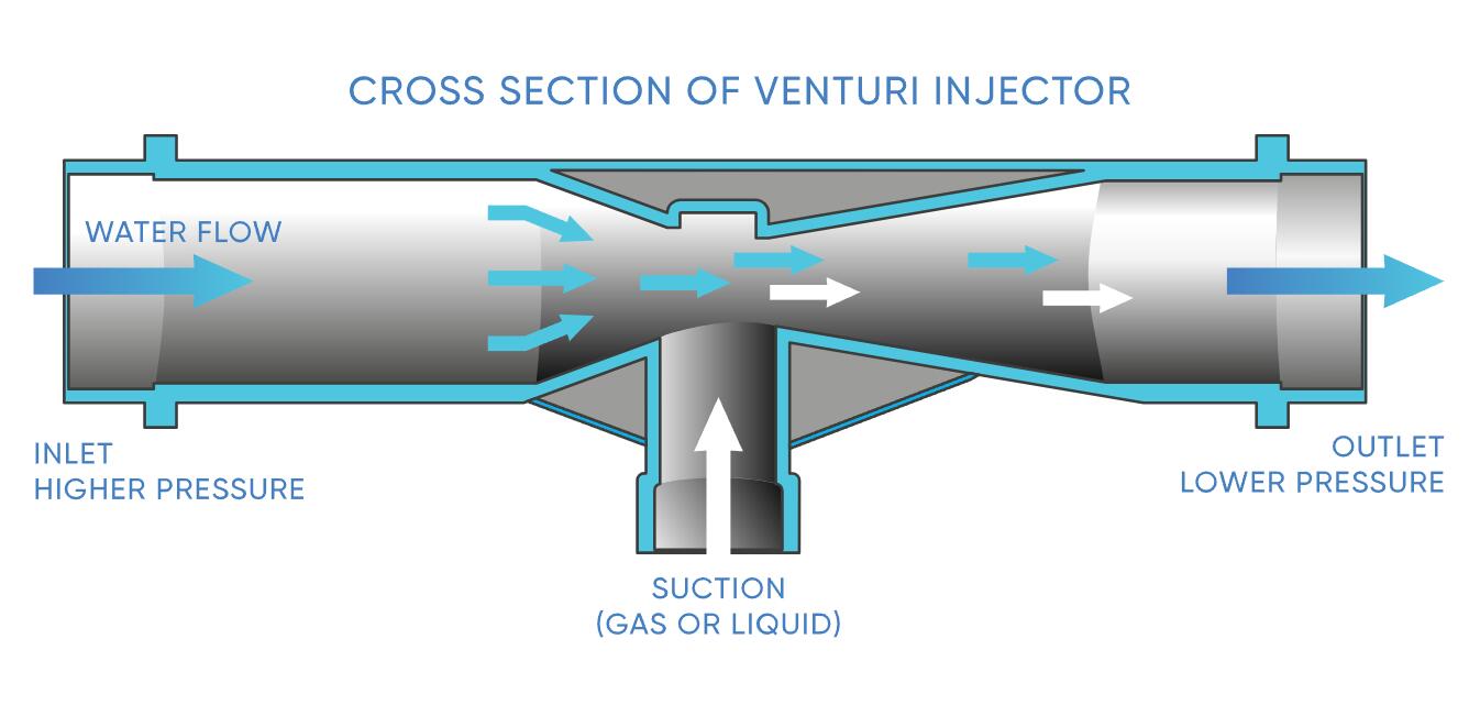 簡而言之,水流入文丘里管的壓力高于其排出的壓力。這種壓差在設(shè)備側(cè)面的吸入口產(chǎn)生真空。這會(huì)將空氣、臭氧或液體吸入主流水流中。因此,壓差越大,真空度越大,混合效率就越高。