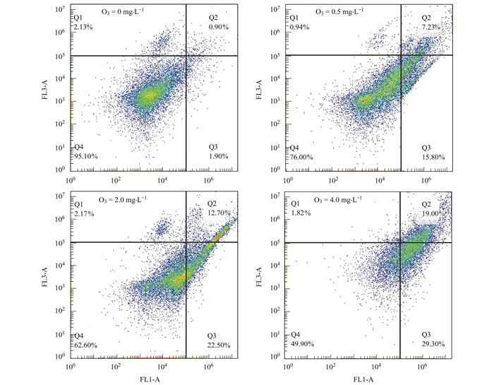 對不同臭氧濃度下BAC上的微生物凋亡特征進(jìn)行分析, 結(jié)果如圖1所示.根據(jù)兩種染色劑的熒光強(qiáng)度, 將圖內(nèi)細(xì)胞劃分為第一象限(上右象限, UR)表示晚期凋亡及死亡細(xì)胞, 第二象限(上左象限, UL)表示碎片及損傷細(xì)胞, 第三象限(下左象限, LL)表示正常細(xì)胞, 第四象限(下右象限, LR)為早期凋亡細(xì)胞.在無臭氧的條件下, BAC上微生物的存活率為95.10%, 在0.5、2.0和4.0 mg·L-1的臭氧條件下, BAC上微生物的存活率分別降至76.00%、62.60%和49.90%, 這表明臭氧會滅活部分BAC上的微生物, 這可能會減弱BAC的過濾效果.但臭氧濃度為2.0 mg·L-1時, BAC的過濾效果反而提高, 這可能是微生物活性增加強(qiáng)化了生物過濾.