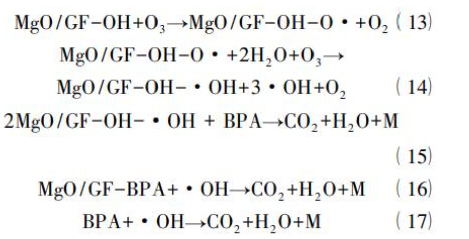 Zhang等利用高比表面積、可折疊的石墨氈(GF)為載體,采用等體積浸漬法制備了MgO/GF催化劑。在中性條件下降解雙酚A(BPA)的過程中發(fā)現(xiàn),與單獨(dú)臭氧化過程相比,加入MgO/GF催化劑可以使BPA和COD的去除率分別增加40.0%和31.6%。通過加入羥基自由基猝滅劑———叔丁醇,間接證明了MgO/GF/O3體系主要遵循羥基自由基的反應(yīng)機(jī)理。同時對反應(yīng)過程中溶解臭氧濃度進(jìn)行檢測,發(fā)現(xiàn)加入催化劑后溶液中的臭氧濃度始終處于較低水平。因此,作者認(rèn)為MgO/GF可以提高臭氧化效率的原因主要是催化劑表面的堿性位可以促進(jìn)臭氧分解產(chǎn)生·OH,如下述方程式所述。
