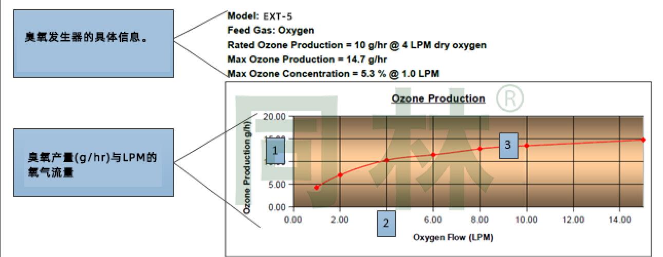 1. 臭氧產(chǎn)量顯示在垂直(Y軸)的圖形上,單位為克/小時或其他臭氧輸出測量單位