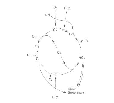 溶解的臭氧的穩(wěn)定性容易受pH,紫外線,臭氧濃度和自由基清除劑濃度的影響。在過量自由基清除劑存在下測量的分解速率(脂族和芳族)可以防止二次反應(yīng),這是通過偽一級動力學表示的。臭氧分解在鏈過程中發(fā)生,其可以由下面的圖1中所示的反應(yīng)表示(基于Staehelin等人,Tomiyasu等人的兩個 很重要的模型),包括引發(fā)步驟,傳播步驟和鏈式反應(yīng)步驟的中斷。 。