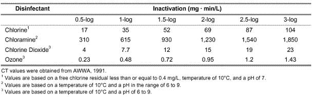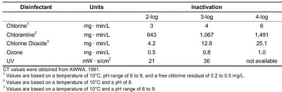 原生動(dòng)物隱孢子蟲很難被氯和氯胺滅活。對于1-log失活(= 90%失活),氯失活的Ct值在3000和4000mg min / L之間變化。兩個(gè)表都來自環(huán)境保護(hù)局(EPA)。